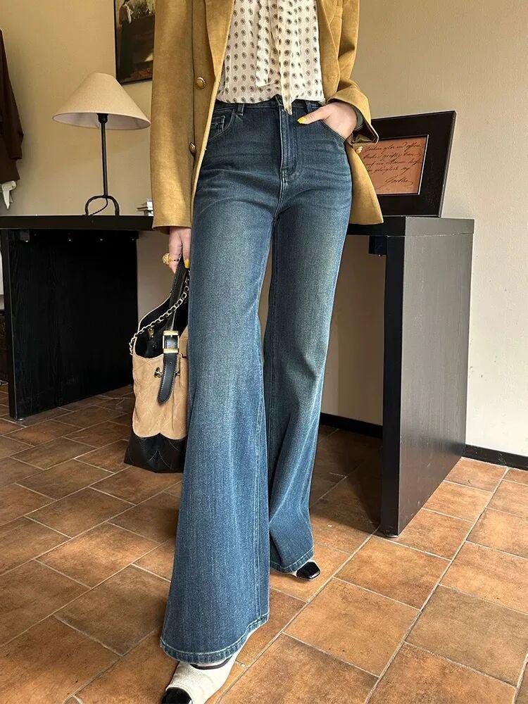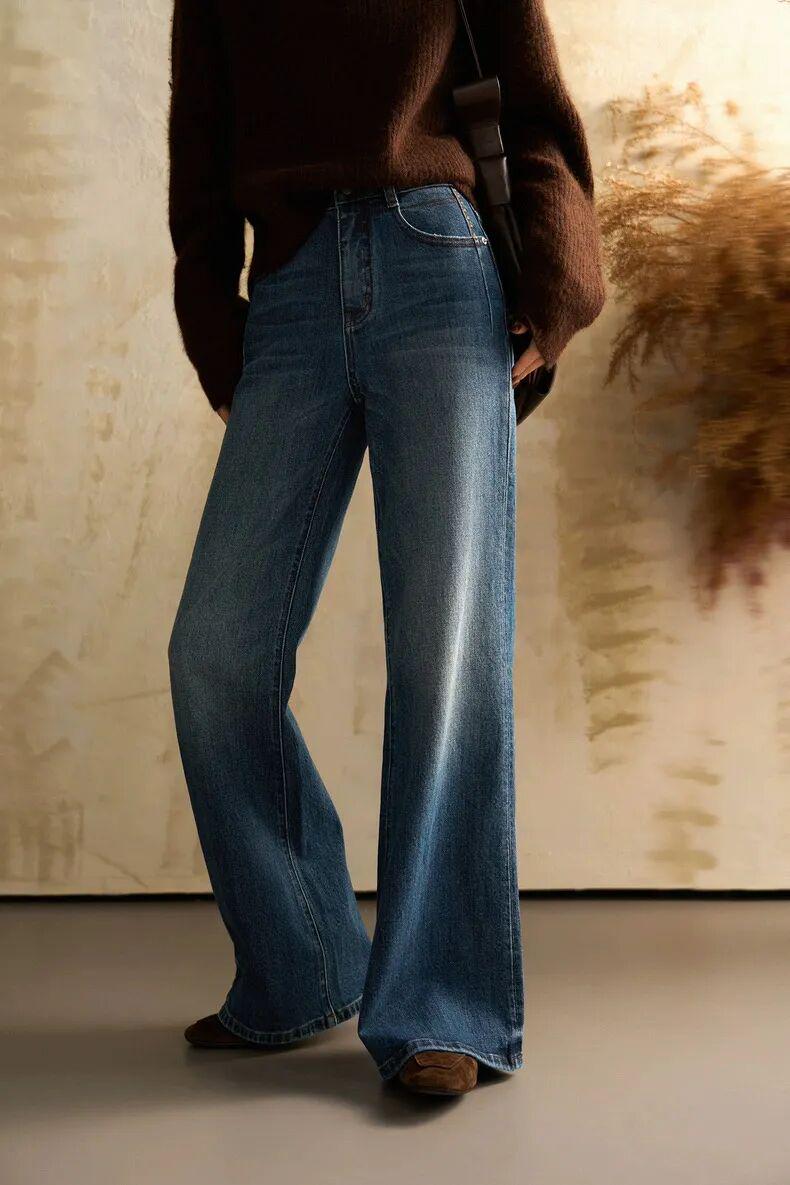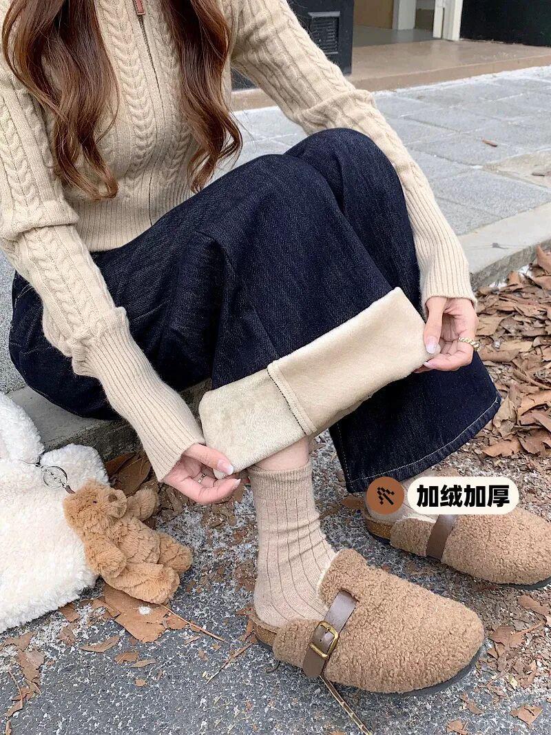 冬季加绒加厚复古水洗微喇拖地牛仔裤